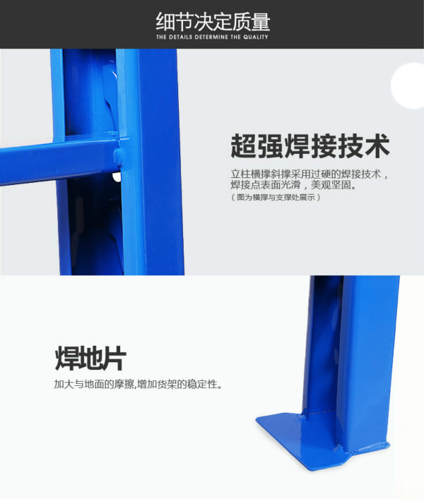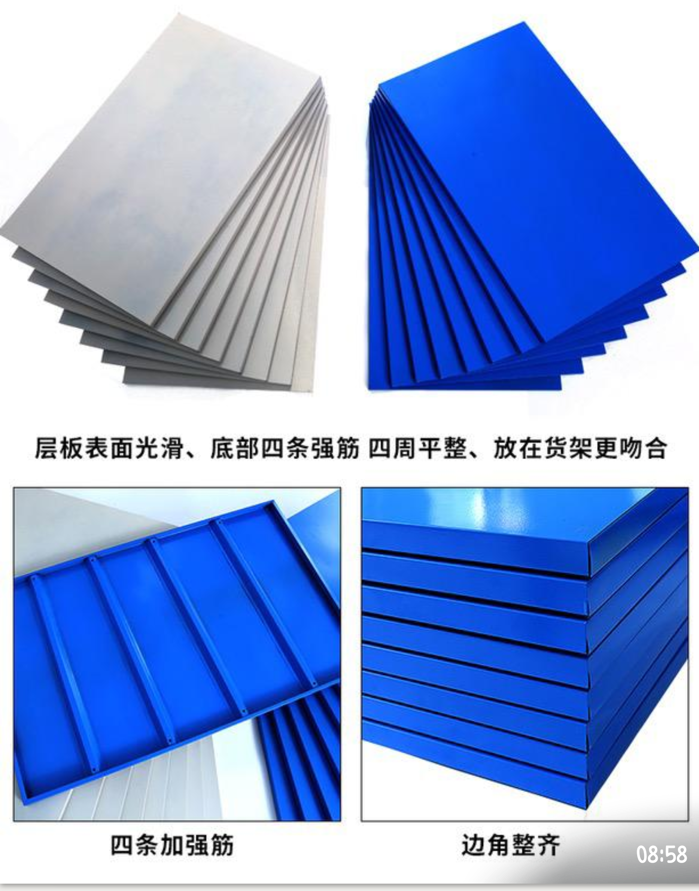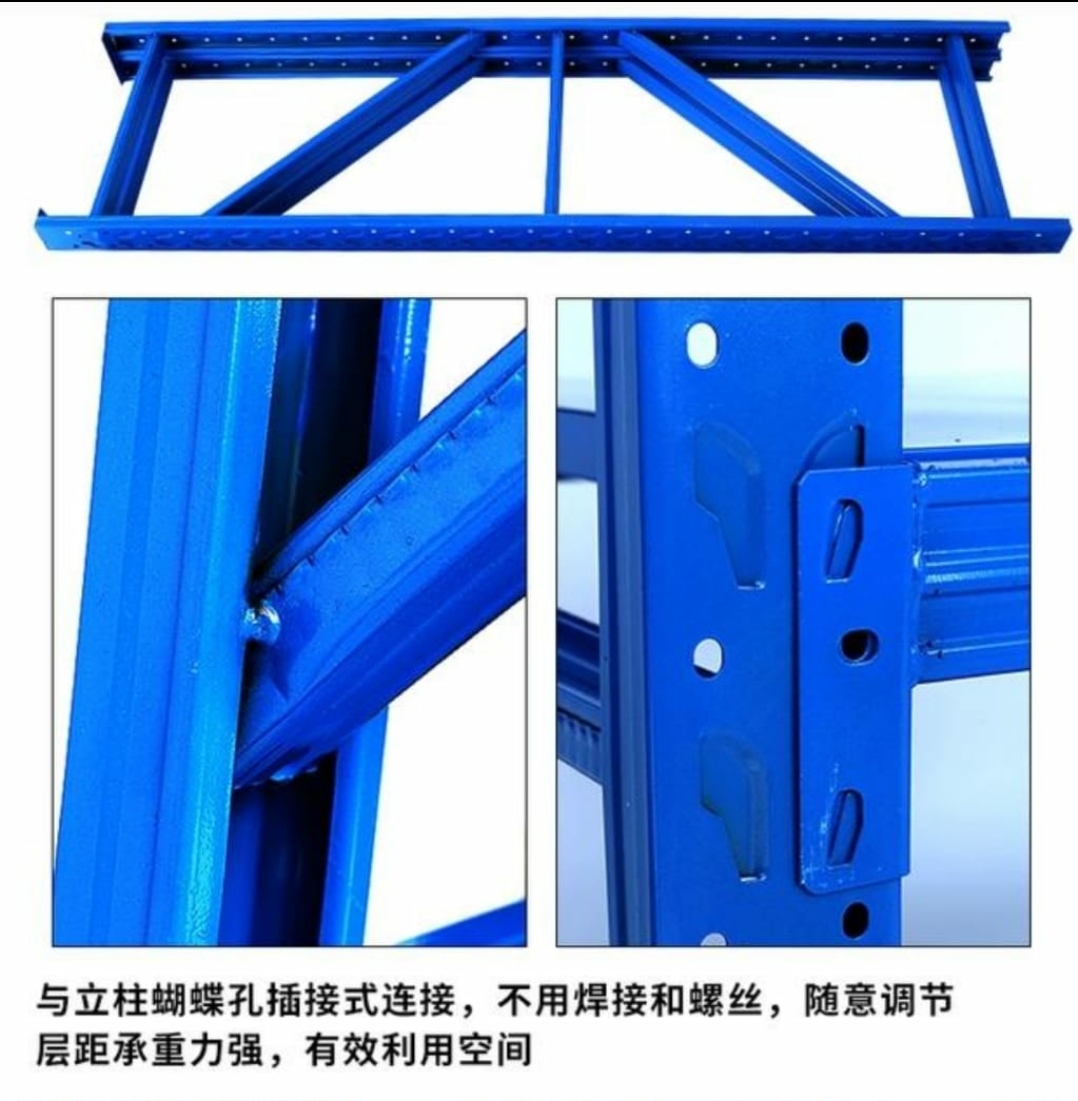 3) 層板有木板和鋼板可供選擇,立柱高度設有每50mm調節孔距,可根據貨物高低調節層間使用。